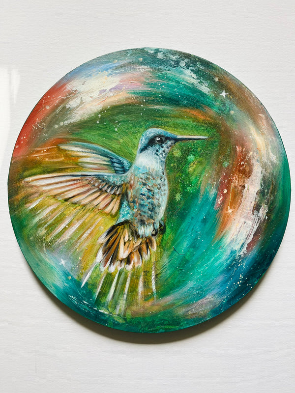 Next comes the messy, experimental part. I layer pan pastels, acrylics, alcohol inks, spray paint…sometimes collage or gold leaf. It’s where intentional marks meet spontaneity and happy accidents. Colours collide, textures build, and the piece starts to find its energy. This is my “play” stage, the part where I let go and explore.